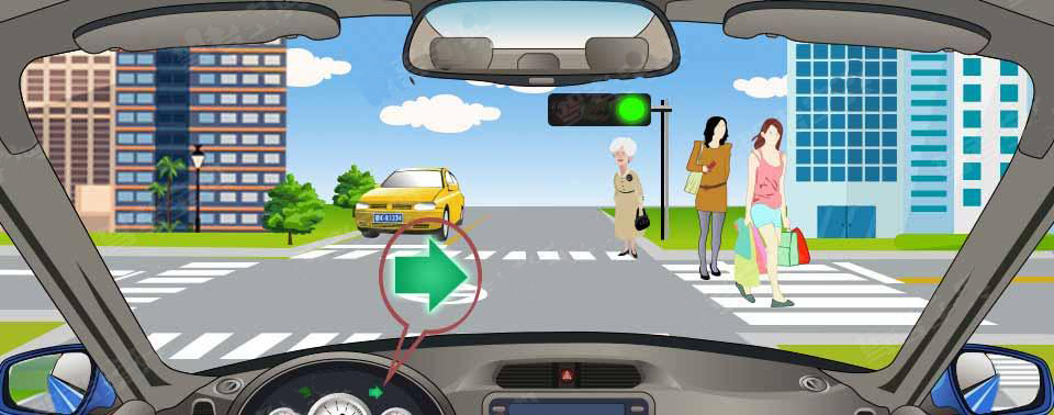 解析:如图所示,图中人行横道有行人,等待两个行人都通过路口再右转弯。