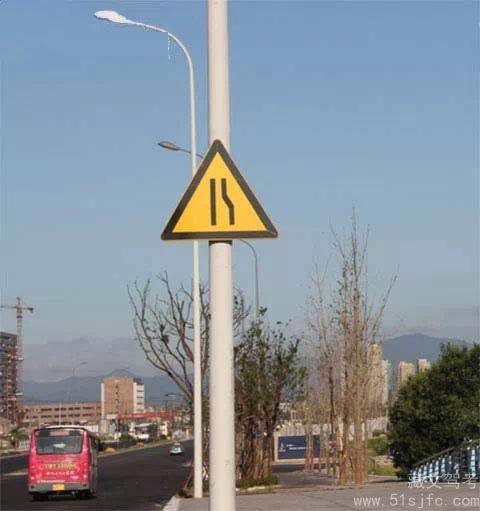 解析:图中是警告标志,警告车辆驾驶人注意前方车行道或路面变窄。