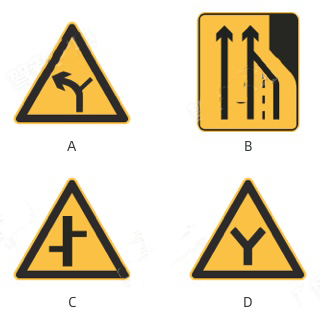 解析:本题主要考察的是道路交通标志。三个车道变成两个车道,代表车道数量变少。因此选择“如图中B所示”。 相关法规参考:GB5768.2-2022《道路交通标志和标线第2部分:道路交通标志》,7.40 注意车道数变少标志,用以提醒车辆驾驶人注意前方车道数量变少。设在变化点前适当位置。