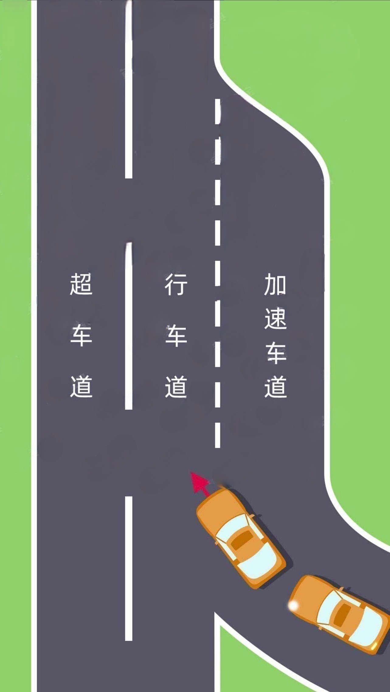 解析:机动车进入高速后,必须经过加速车道加速,打开左转向灯,确认安全后再进入行车道。