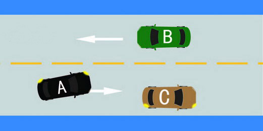 22、如图所示,驾驶机动车在这种情况下,当C车减速让超车时,A车应该如何行驶?