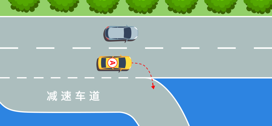 解析:由图可知A车想进入减速车道,只能提前从虛线处进入,但是已经错过路口只能继续行驶,在下一个路口进入,不得压实线行驶。
