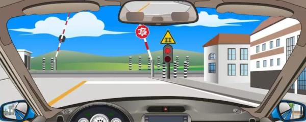 解析:如图所示,驶近一个设有信号灯和栏杆的铁路道口,遇到图中所示信号灯亮着,但栏杆还没落下,应在道口的停止线以外停车等待。
