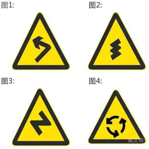 解析:图1表示向左急转弯,警告驾驶人减速慢行;图2表示连续弯路,警告驾驶人减速慢行;图3表示反向弯路,警告驾驶人减速慢行;图4表示交叉路口,警告驾驶人谨慎慢行,注意横向来车。
