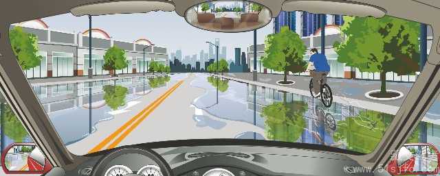 解析:그림에서 알 수 있듯이, 방금 비가 내린 노면일 것이다. 미끄러운 노면 주행은 감속 서행에 주의해야 한다. 또한 비자동차를 추월할 때 물이 튀지 않도록 주의해야 한다.그래서 이 문제는 틀렸다.