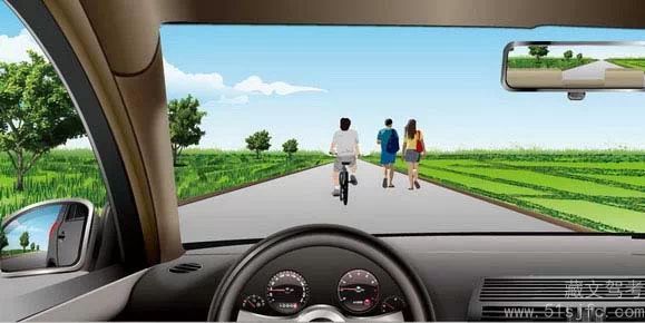 解析:前方有行人和自行车,道路较窄,驾驶机动车遇到这种情况,可以轻按喇叭提醒前方非机动车和行人后方有来车,这样更加安全;而且不是城市道路。
