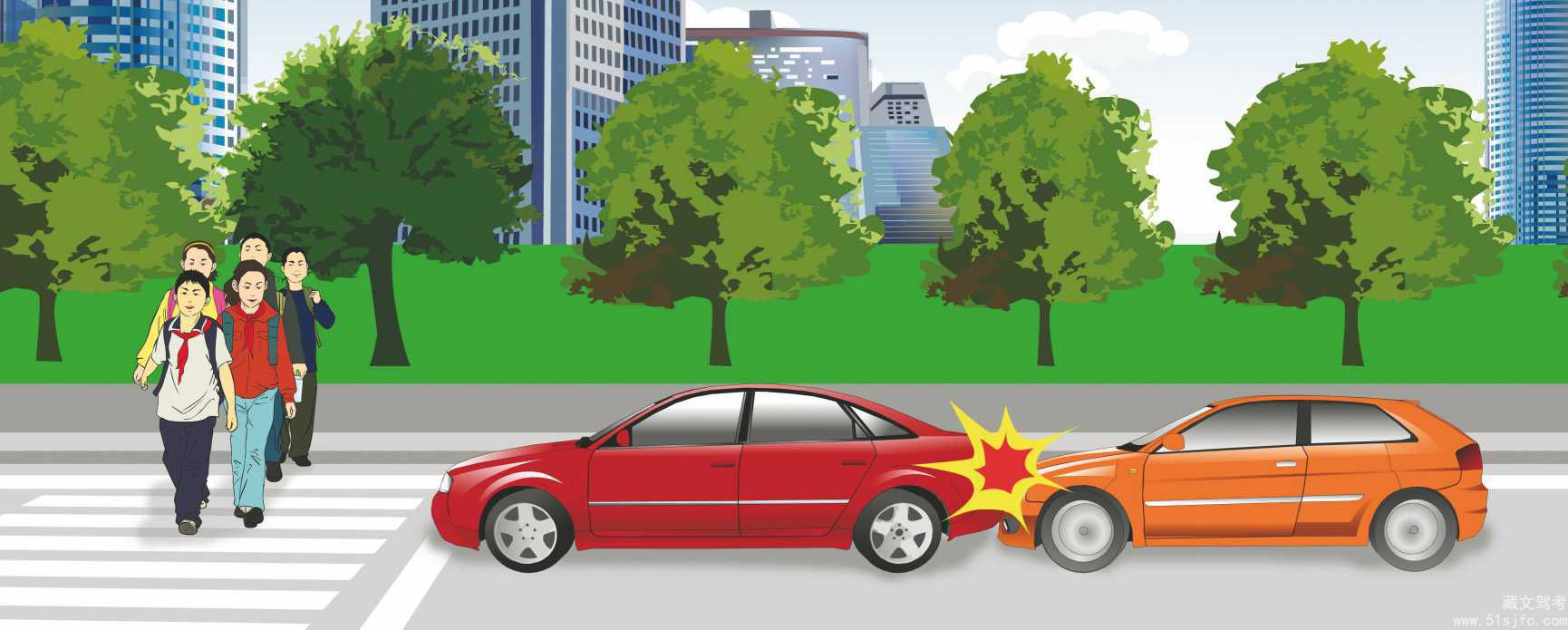 解析:看到前方是人行横道,车辆应该提前减速。后车没有提前减速并且与前车保持安全距离,所以才会导致的碰车。
