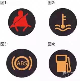 解析:图1表示安全带插头未插入锁扣;图2是水温指示灯;图3是ABS指示灯;图4是燃油指示灯。
