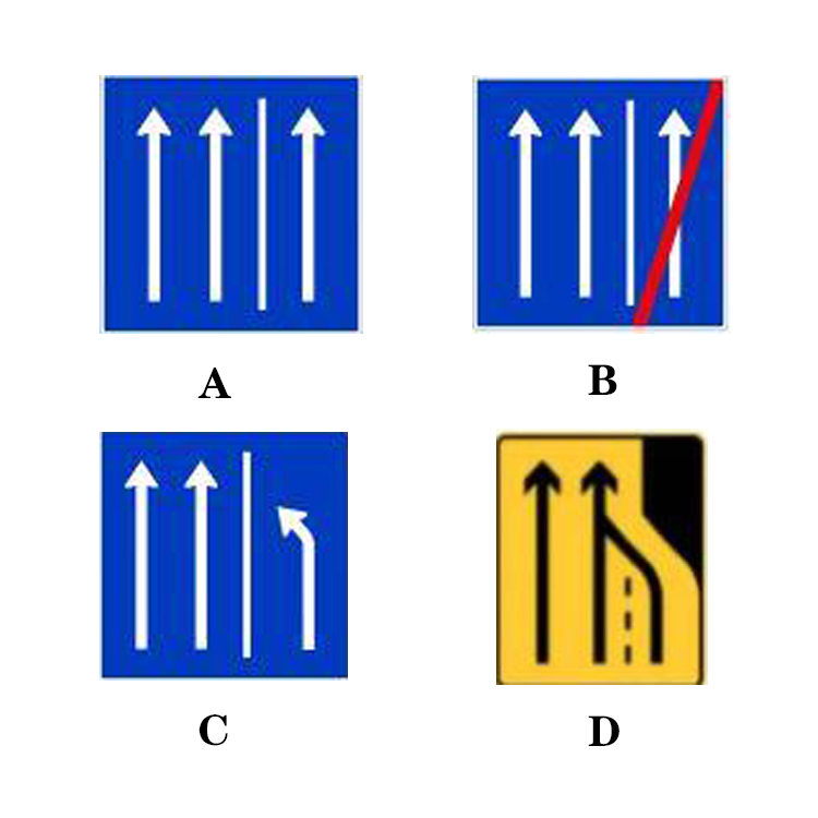 解析:本题主要考察的是道路交通标志。注意图片名称与选项的对应关系。图A是硬路肩允许行驶路段的起点,图B是硬路肩允许行驶终点,图C三个车道中最右边的车道开始向左合流,代表硬路肩允许行驶路段即将结束,图D代表车道数量减少。因此选择“如图中C所示”。 相关法规参考:GB5768.2-2022《道路交通标志和标线第2部分:道路交通标志》,6.33硬路肩允许行驶标志,表示该处硬路肩允许车辆通行。一般需设置辅助标志说明硬路肩允许通行的时间。硬路肩允许行驶起点表示硬路肩允许行驶路段开始,设在硬路肩允许行驶路段的起点处;硬路肩允许行驶路段即将结束表示硬路肩允许行驶路段即将结束,车辆应尽快合流,设在合流点前适当位置;硬路肩允许行驶终点表示硬路肩允许行驶路段结束,设在硬路肩允许行驶路段的终点处。