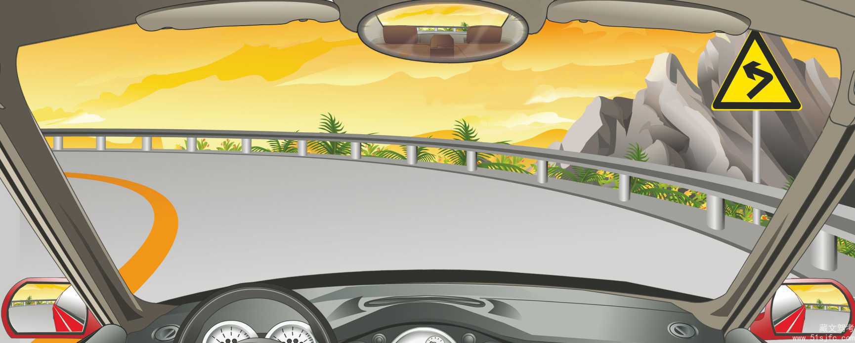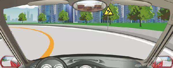 解析:如图所示,右侧是向左急转弯警告标志,表示在急转弯路段。根据《道路交通安全法实施条例》第五十九条规定:机动车在夜间通过急弯、坡路、拱桥、人行横道或者没有交通信号灯控制的路口时,应当交替使用远近光灯示意。机动车驶近急弯、坡道顶端等影响安全视距的路段以及超车或者遇有紧急情况时,应当减速慢行,并鸣喇叭示意。