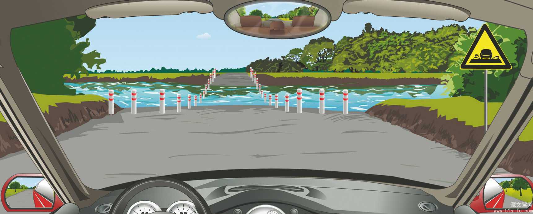 解析:《道路交通安全法实施条例》第六十四条:机动车行经漫水路或者漫水桥时,应当停车察明水情,确认安全后,低速通过。