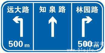 解析:此标志表示大交通量的四车道以上公路交叉路口预告。分向行驶车道边上是虚线,下面没有距离标志。交叉路口标志是这个,有距离的数字。