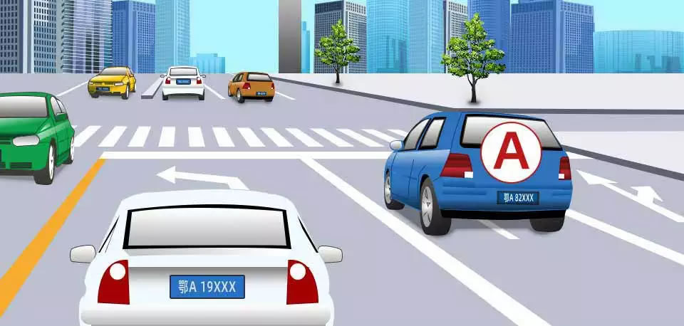 解析:A车所在车道是直行车道,如需左转弯,只能在左转弯车道进行转弯。目前已错过转弯机会,应当直行通过后,重新选择行驶路线
