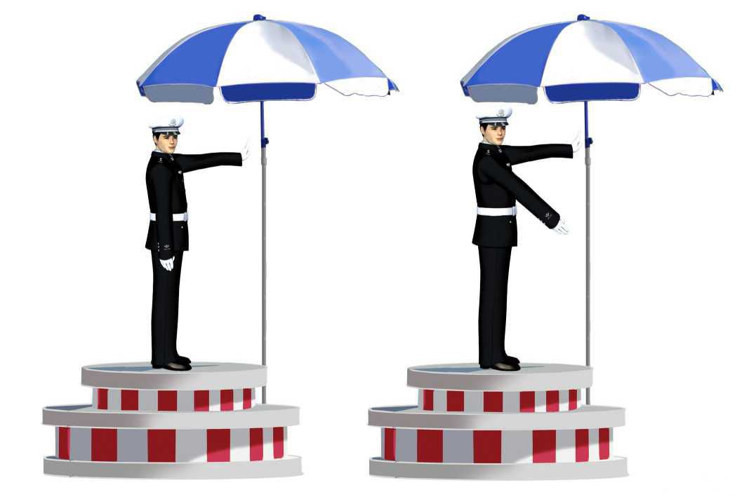 解析:如图所示,交警的手表示准许右方车辆右转弯手势。